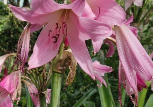 Rechts naast het hoofdpad is gedurende het jaar een hoop van lange lichtgroene bladeren te zien. In de zomer verschijnen er bloemstengels met daarop een groep van rond de acht mooie roze bloemen. De bloemen zien er lelie-achtig uit, de bloeiwijze doet ook wel denken aan de Amaryllis. Met deze laatste is deze soort verwant,