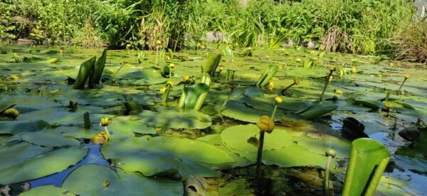 Voor de ingang aan de rechterkant in het water ziet u gele bloemen uit het water steken. Dat is de Gele plomp. De soort ...
