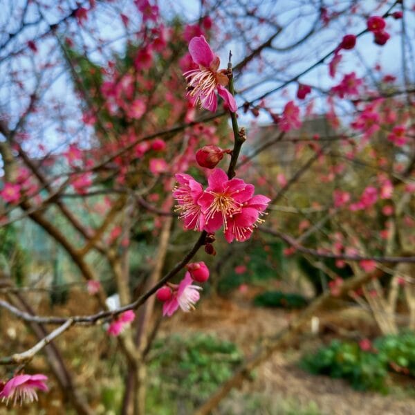 Wie in februari de tuin in loopt kan verrast worden door de boom met dieprode bloemen rechts van het hoofdpad. Het is de umeboom die ook wel Chinese pruim of Japanse abrikoos wordt genoemd. Een naamgeving die je in verwarring kan brengen. De groengele vrucht lijkt eerder op een abrikoos. In tegenstelling tot de ons bekende abrikoos (Prunus armeniaca) is deze echter niet zoet, maar erg bitter.